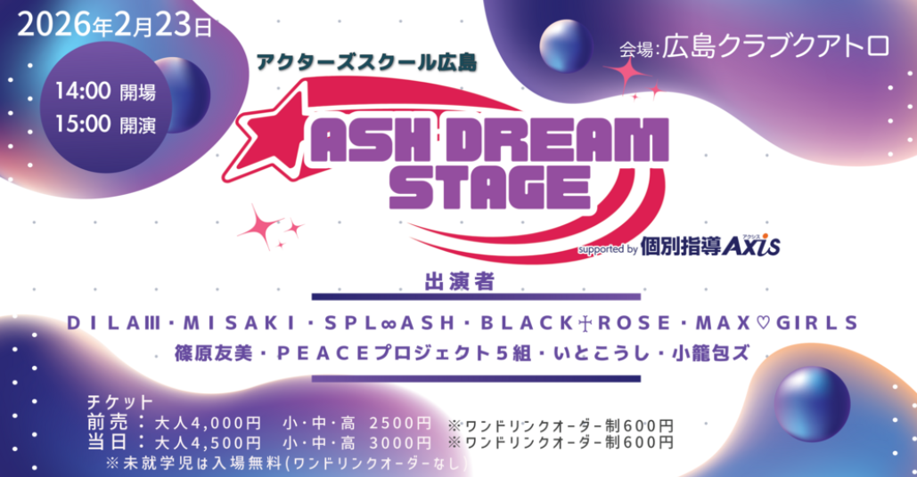 まさに、アクターズスクール広島始まって以来の“夢ライブ”です。この機会をお見逃しなく。